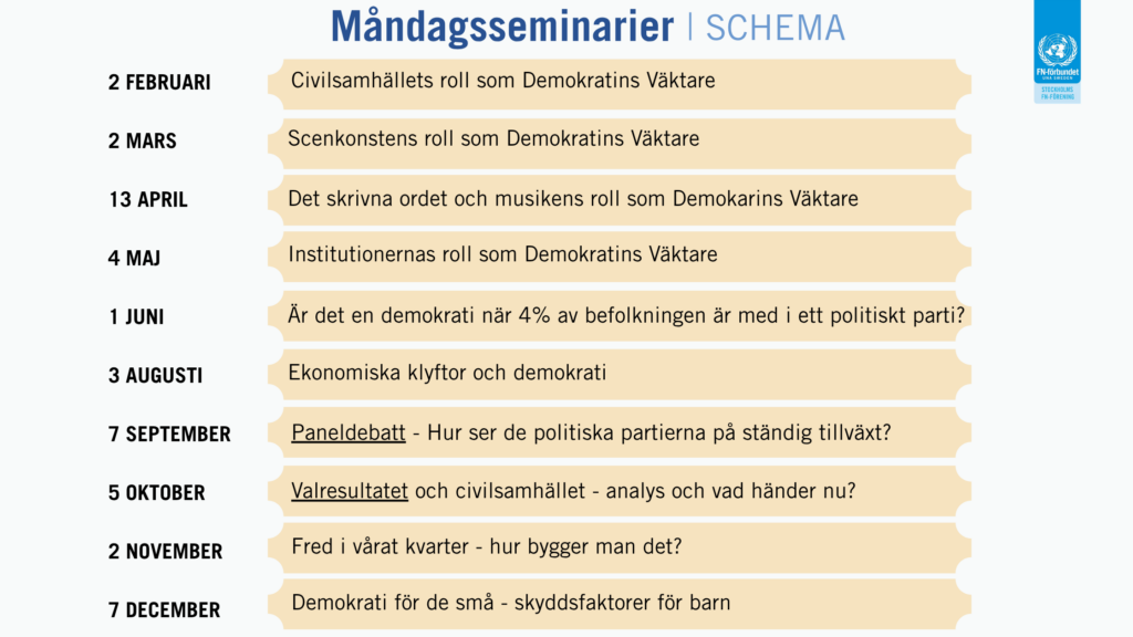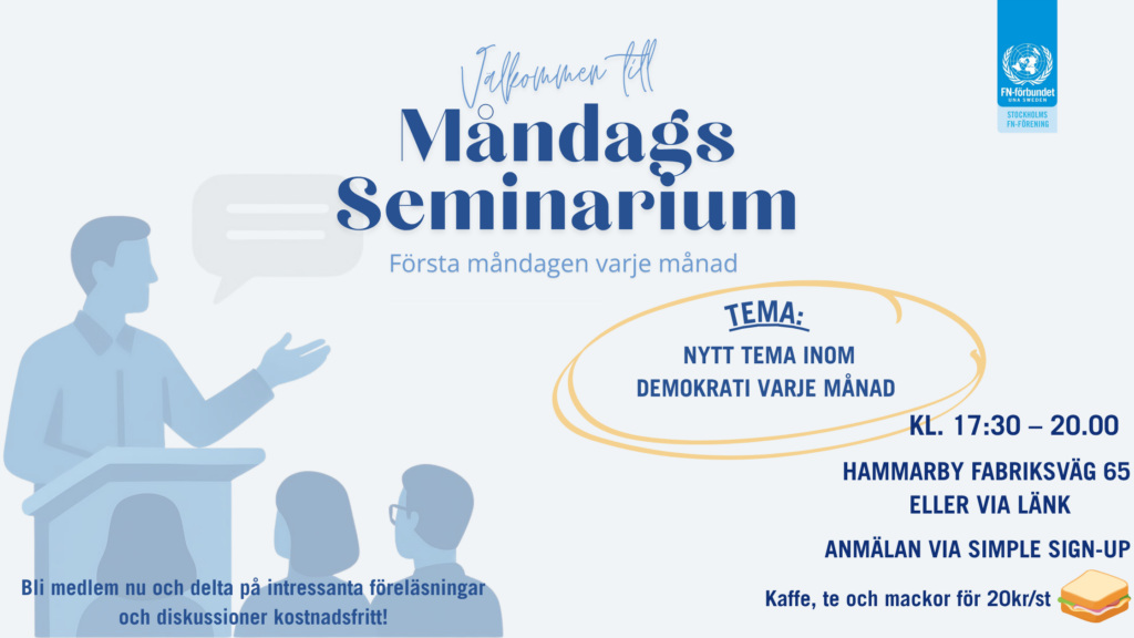 Innan pandemin hade Stockholms FN-förening varje månad ett seminarium för sina medlemmar. Detta har vi nu dragit igång igen! Första måndagen i månaden är medlemmar välkomna till vårt kansli i Hammarby Sjöstad för spännande diskussioner. Under våren och början av hösten kommer vi under seminarierna att fokusera på demokrati för att förbereda oss inför riksdags-, region-, och kommunvalet i september.